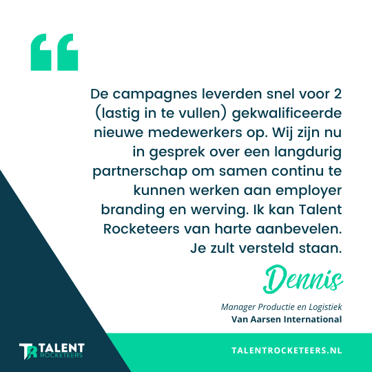 Als manager productie & logistiek ben ik en ook onze HR-afdeling zeer tevreden over de samenwerking met Talent Rocketeers. Het is voor ons een hele nieuwe aanpak welke een aanzienlijke besparing in tijd en kosten heeft opgeleverd met een goed resultaat. De directe toegang tot kandidaten in het dashboard, met volledige inzicht over hun gegevens en de snelheid waarmee alles werd opgevolgd, werkten perfect.